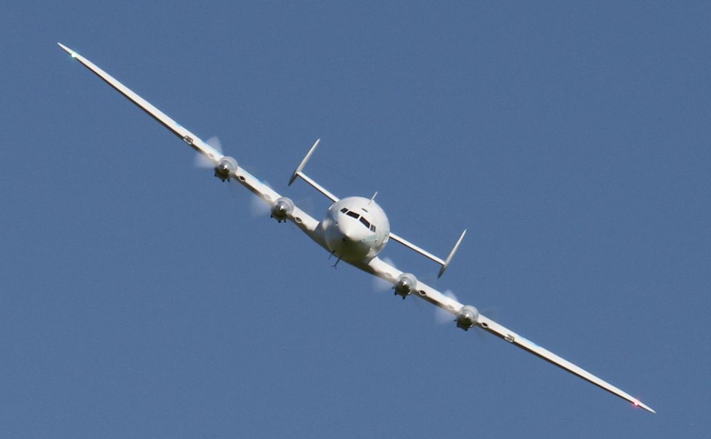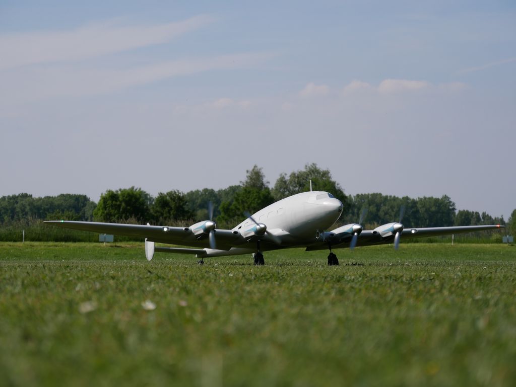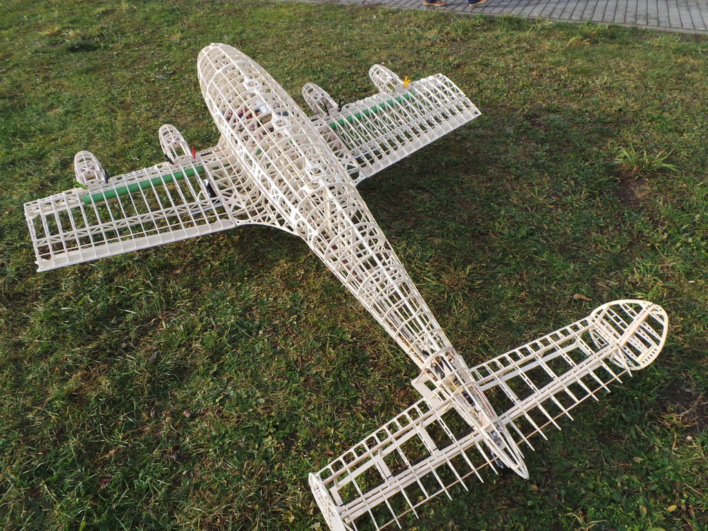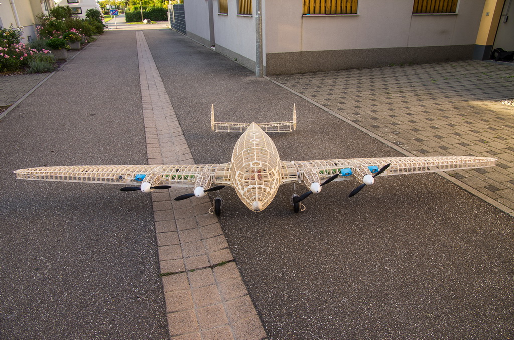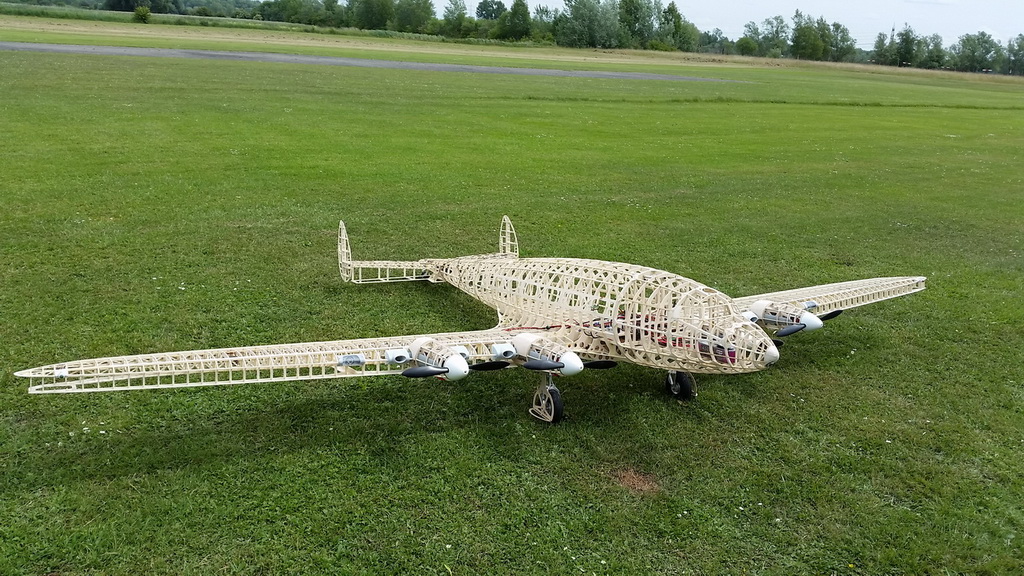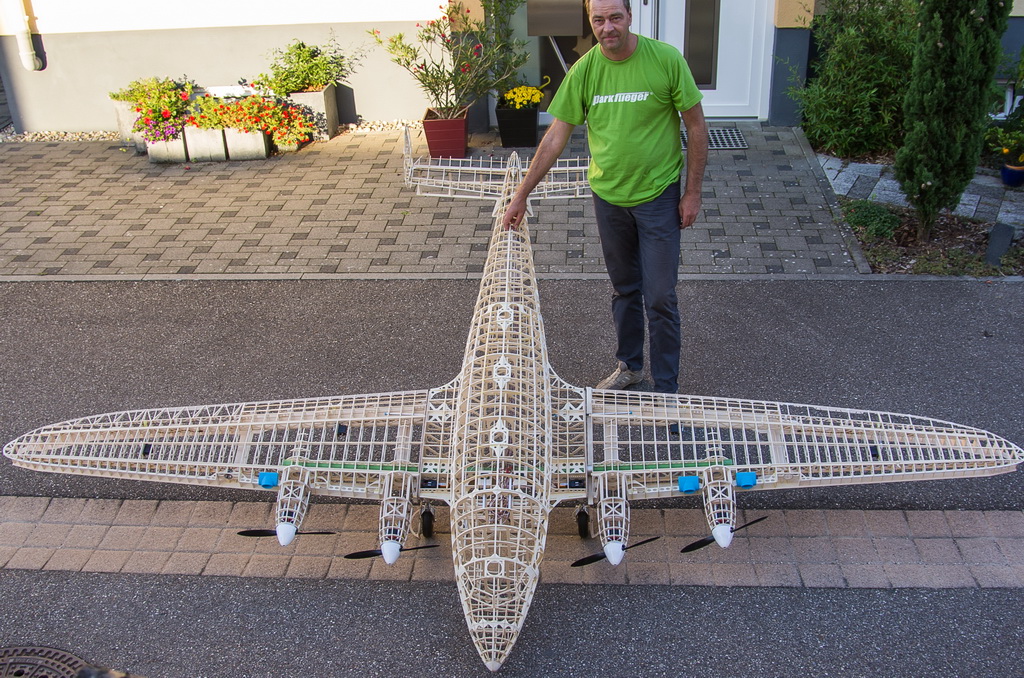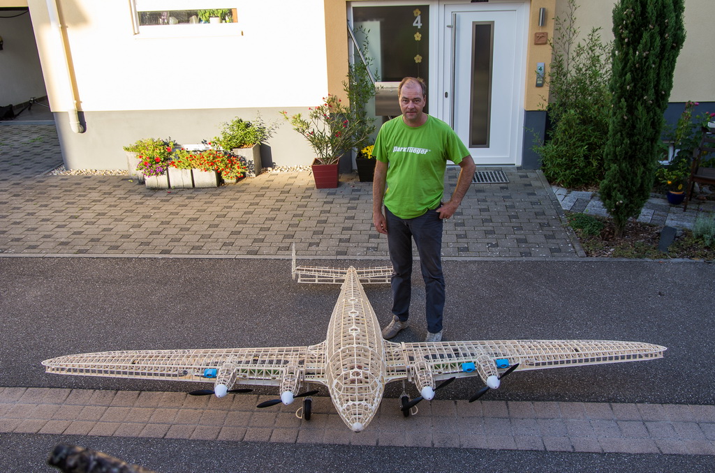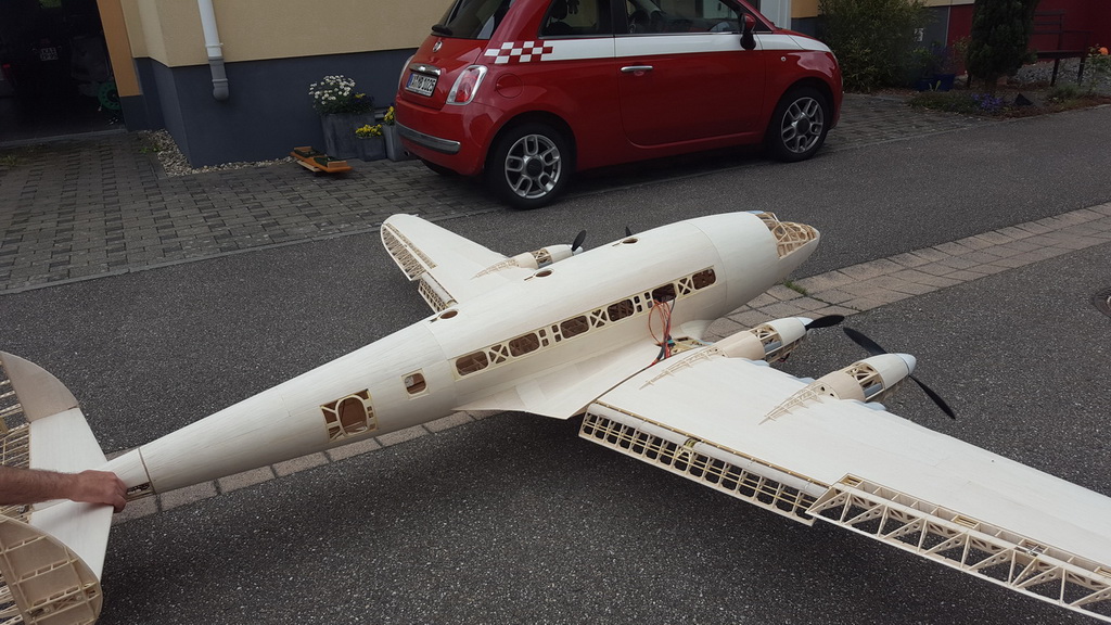 Feb-2014: hier der Rohbau mit den ersten Flächenstücken und den vier Motorgondeln. Alles ist noch mit Klammern gesichert und nur gesteckt. Motoren und Spinner fehlen noch.