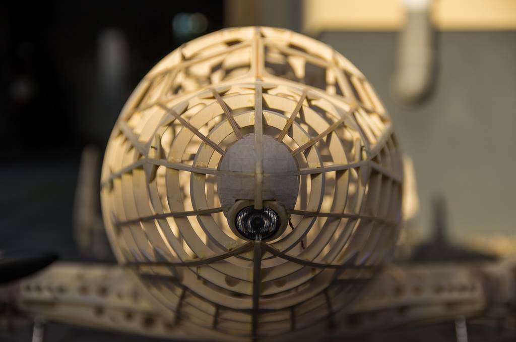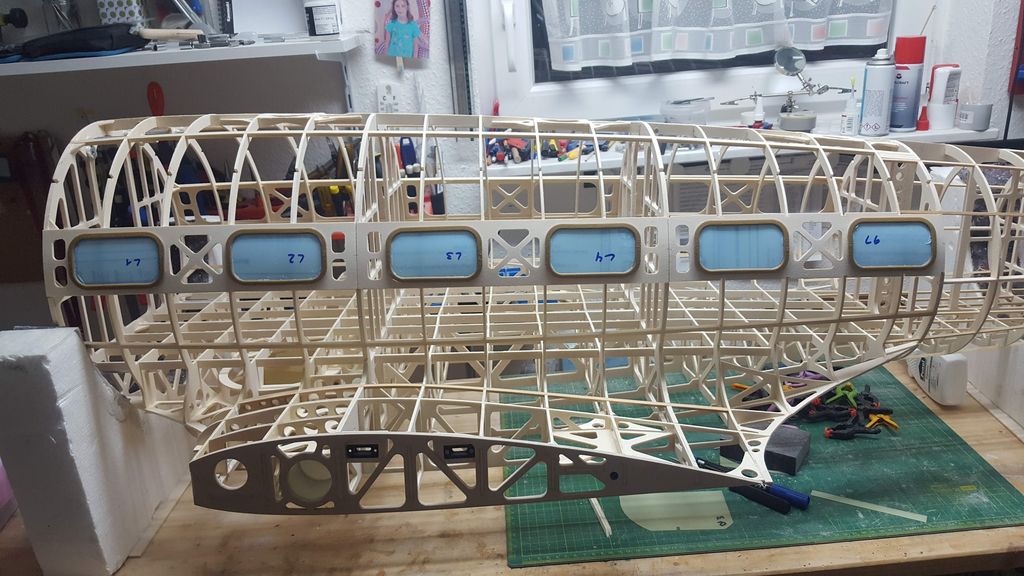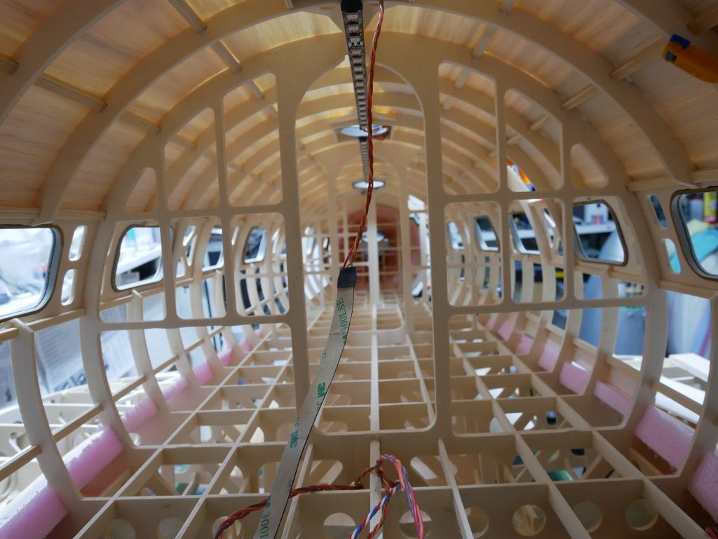Es wurden die Fensterrahmen und die runden Oberlichter gedruckt und eingepaßt. Die Fahrwerksabdeckung wurde verbessert und Züge installiert die die Klappen schließen.