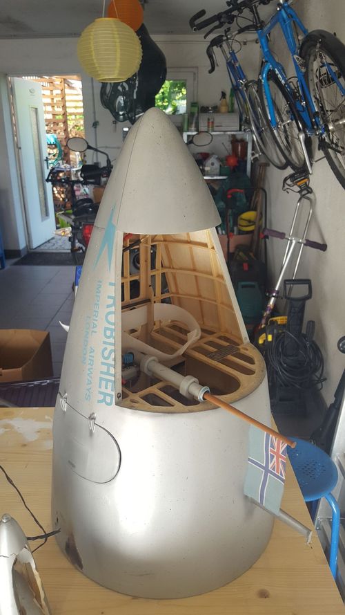 Von Nov 2018 bis zurm Airlinertreffen 06/2019 versuche ich den Flieger wieder aufzubauen. Der Rumpf muß neu gebaut werden, die Flächen können noch restauriert werden,