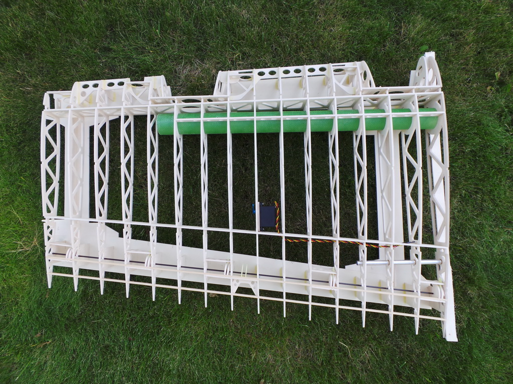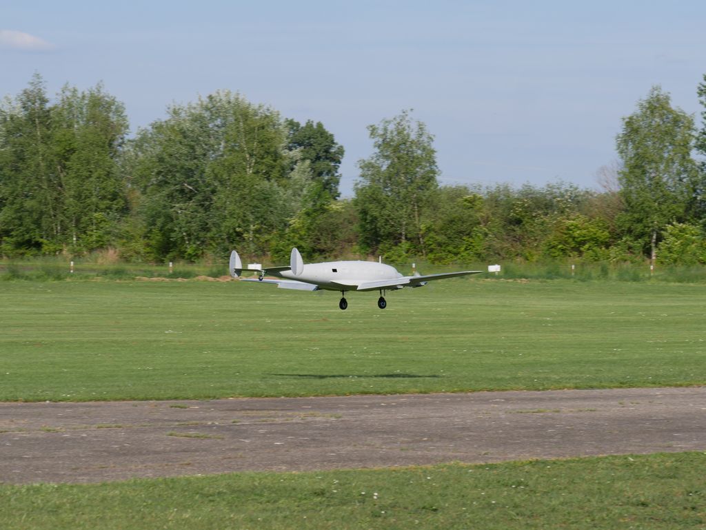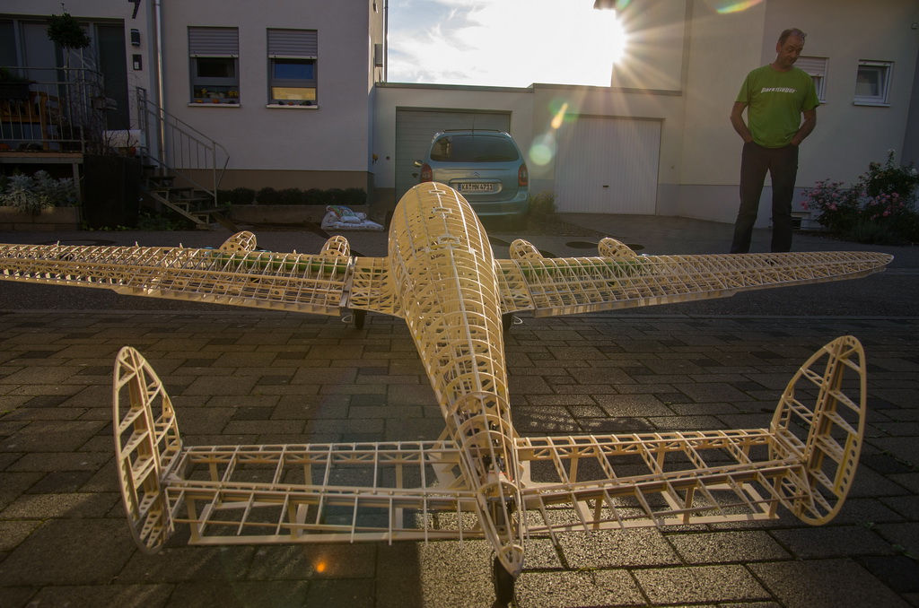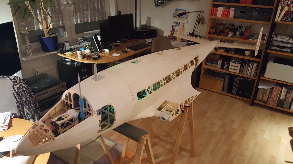 2017 Über den Winter ist jetzt alles beplankt, einmal mit Porenfüller gestrichen und die Klappen und Ruder bespannt. Im Mai war ein erstes zaghaftes Abheben möglich.