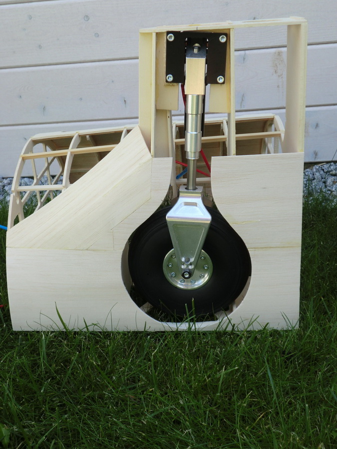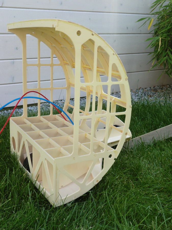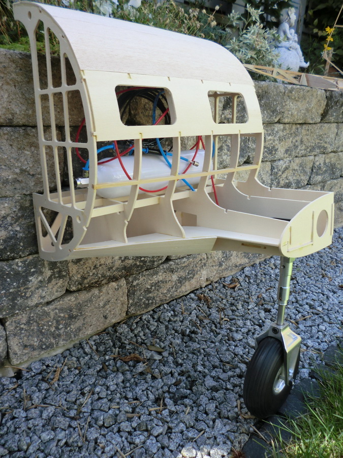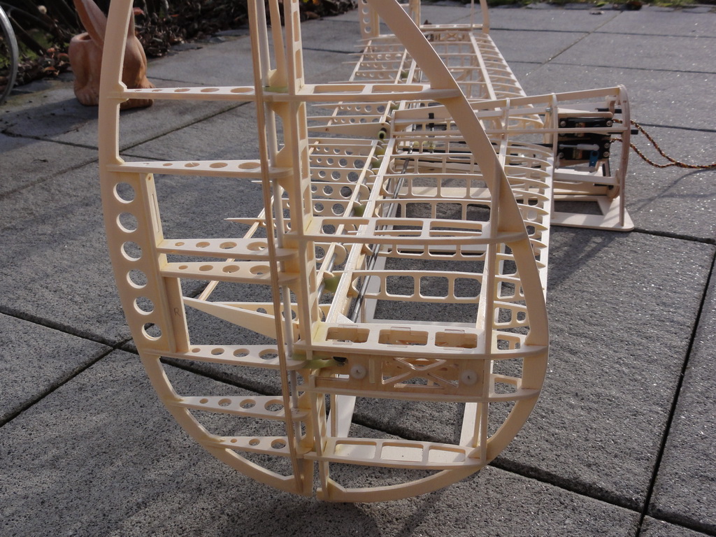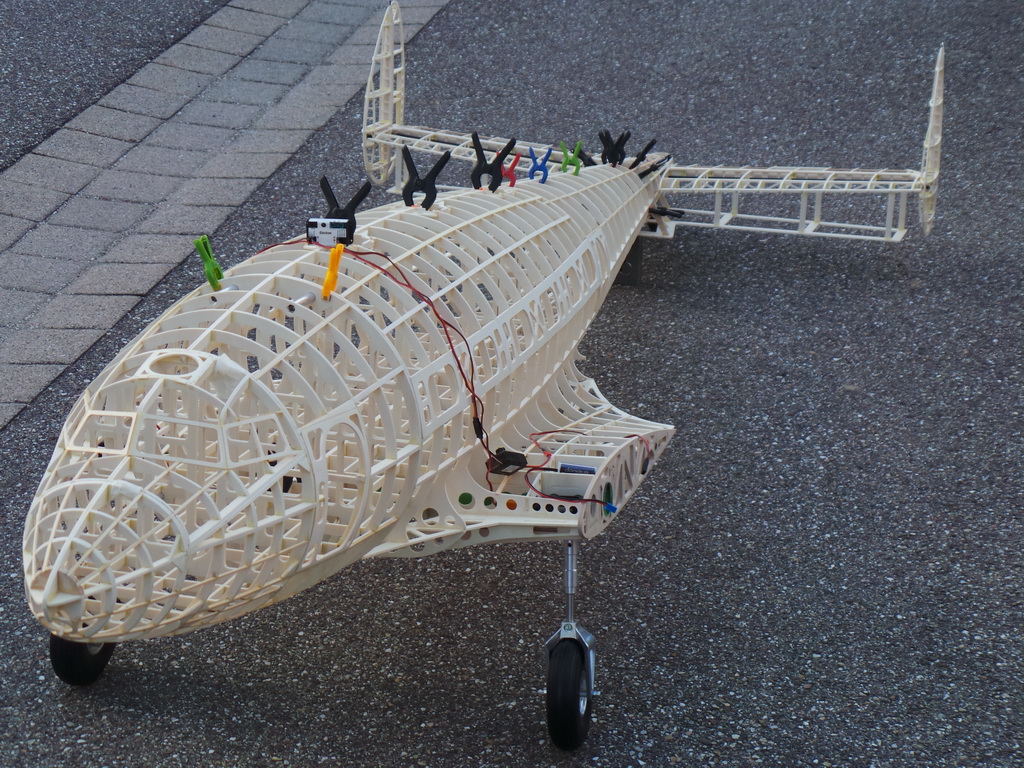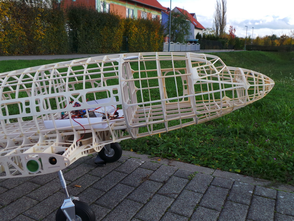 Nov-2013: Der Rumpf ist im Rohbau (ohne Beplankung) fertig. Fahrwerk ist eingebaut und Bremsen funktionieren, ein Landescheinwerfer vorn und hinten eine weiße Positionsleuchte sind angeschlossen. Das Gewicht mit Fahrwerk und einem Teile der Elektronik liegt bei ca 5 Kg - das sieht soweit noch ganz Ok aus.