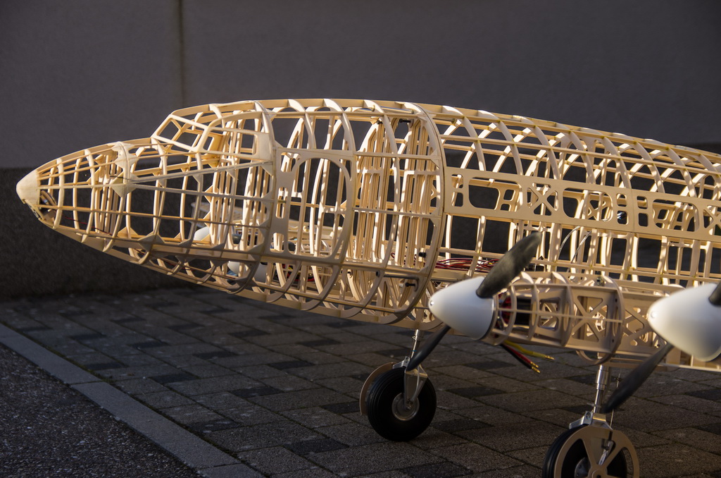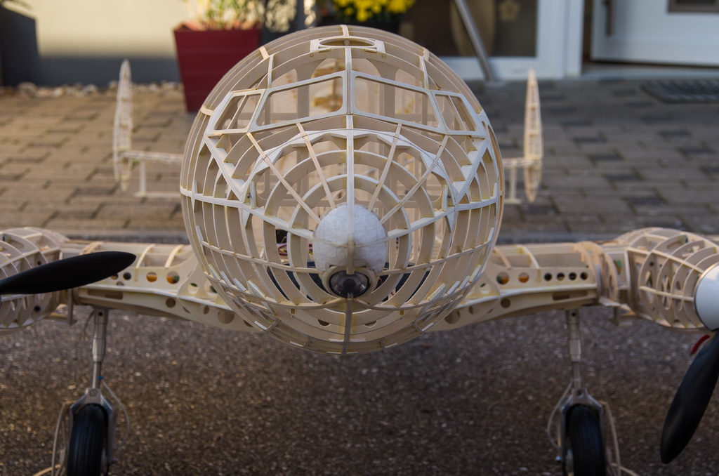 Feb-2014: Die Motorgondeln haben Stehbolzen bekommen und die Motoren sind in den Motorgondeln drin. Jeweils ein speziell angepasster Spinner und ein Vario Prop 15'' mit C7 Nabe ist montiert. Die Motorleistung liegt bei ca 1kw und 40-50 Ah (gemessen im Stand ca. 3 Kg Schub)