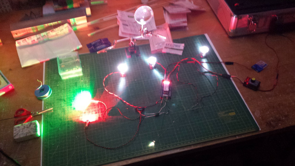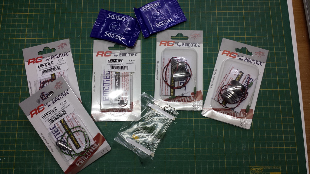 April-2013: Die Beleuchtungskomponenten sind da. Geplant für die Beleutung sind Positionslichter, ein Hecklicht, zwei Landescheinwerfer in den Flächen und ein Taxi Licht in der Rumpfnase unterhalb vom Cockpit. Verbaut werden Landescheinwerfer 29mm Durchmesser und Positionslampen "SEOUL Power LED 3 Watt Kühlstab" mit der Optotronix Aurora LCU.
