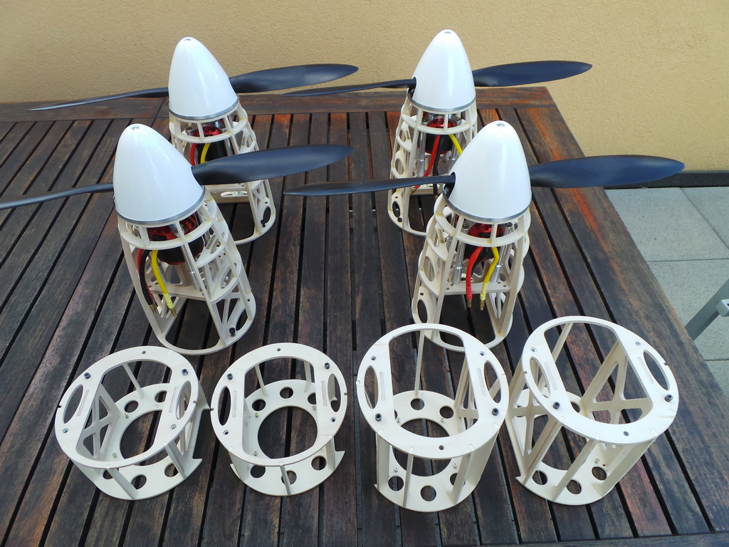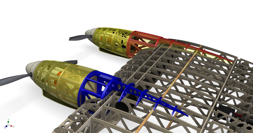 Jan-2014: Die vier Motorgondeln werden begonnen. Es werden vier gleiche Gondeln mit je zwei unterschiedlich langen Verbingungsstücken zur Fläche gebraucht. Zwei lange für die inneren Gondeln und zwei kürzere für die äußeren Gondeln.