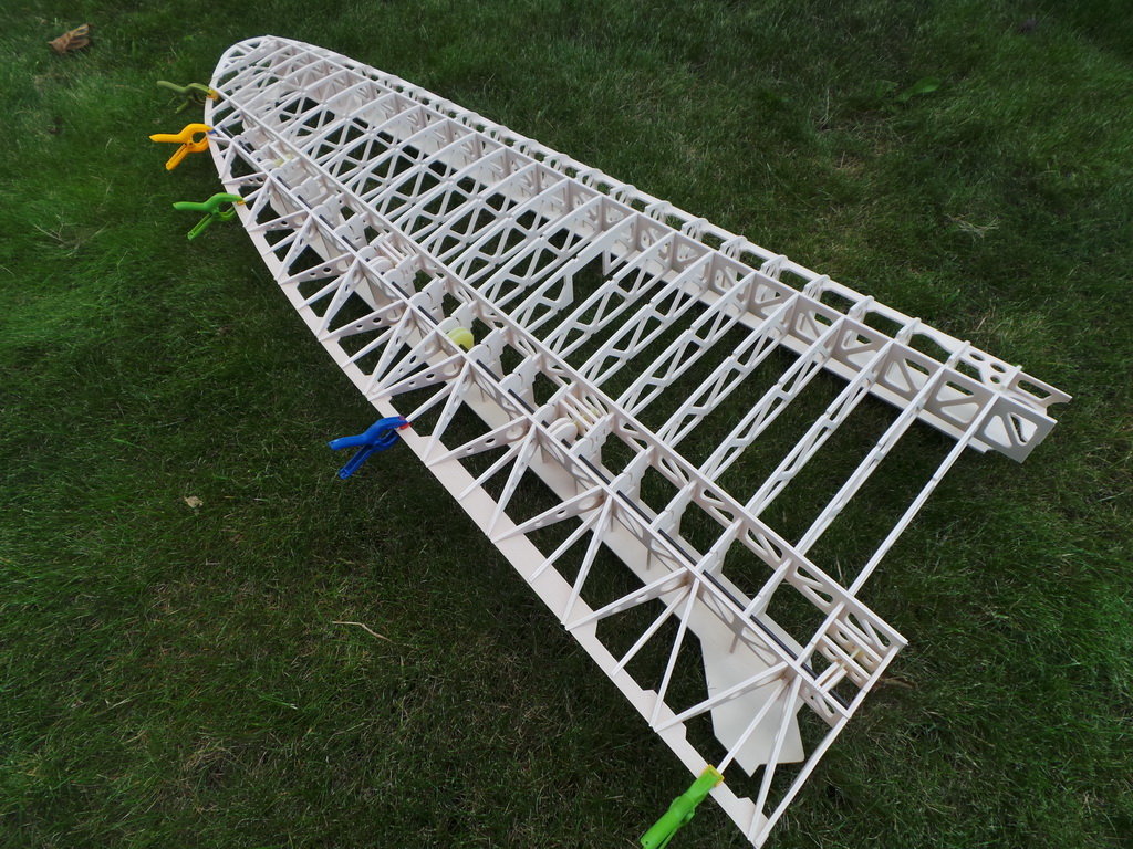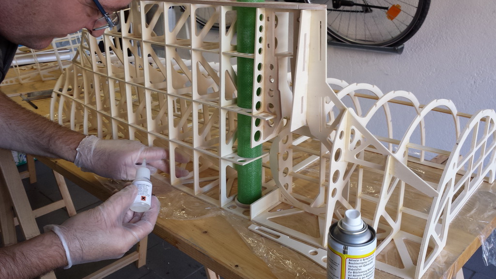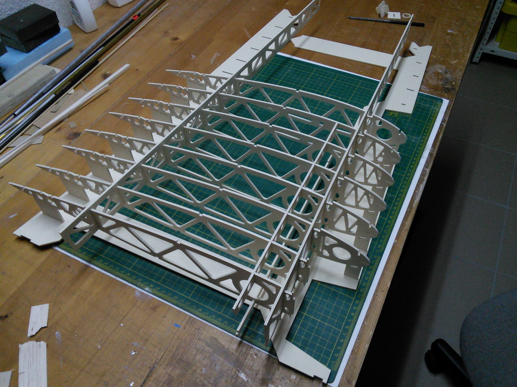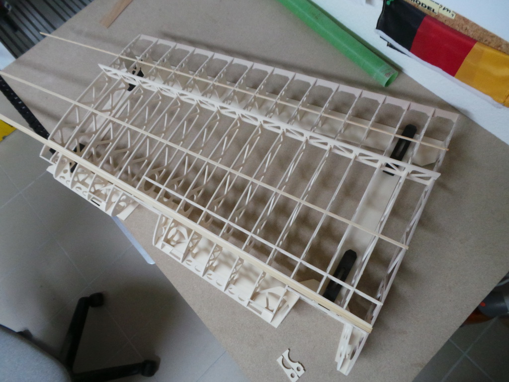 Mai-2014: Die Aussenflächen mit Querruder werden begonnen. Es muß aber alles noch verschliffen und verklebt werden und mit den geschäfteten Holmen mit dem inneren Flächenstück verbunden werden.